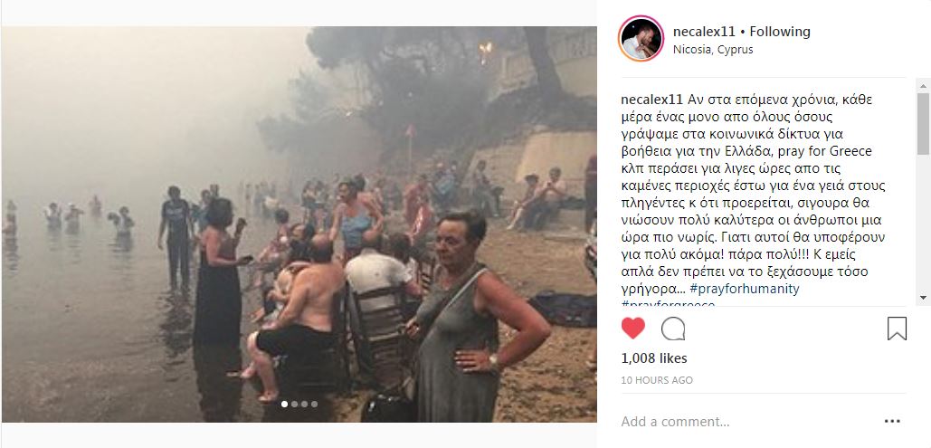 Ο γνωστός ποδοσφαιριστής, έγραψε στη λεζάντα της φωτογραφίας που δημοσίευσε: "Αν στα επόμενα χρόνια, ένας μόνο από όλους όσους γράψαμε στα κοινωνικά δίκτυα για βοήθεια για την Ελλάδα, pray for Greece κλπ. περάσει για λίγες ώρες από τις καμένες περιοχές έστω για ένα γειά στους πληγέντες και ότι προαιρείται, σίγουρα θα νιώσουν πολύ καλύτερα οι άνθρωποι μια ώρα πιο νωρίς. Γιατί αυτοί θα υποφέρουν για πολύ ακόμα! Πάρα πολύ! Και εμείς απλά δεν πρέπει να το ξεχάσουμε τόσο γρήγορα…"