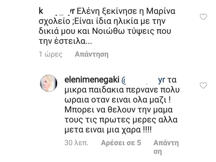 Η Μενεγάκη, θέλησε να απαντήσει και σε σχόλιο διαδικτυακής της φίλης, κατά πόσο νιώθει τύψεις που έχει στείλει τη μικρή της στον παιδικό σταθμό, καθώς κι εκείνη βιώνει μία αντίστοιχη κατάσταση.