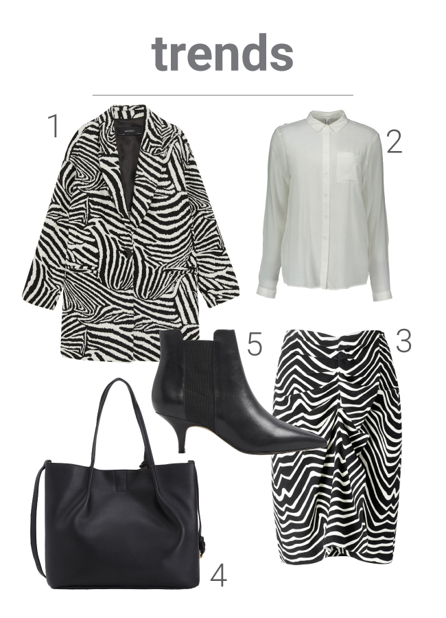 Το black & white zebra print μπορεί κάλλιστα να αποτελέσει μια fashionable επιλογή για ένα εναλλακτικό και trendy office look. Επιλέξτε κομμάτια σε κλασσική γραμμή όπως η pencil φούστα και το single-button fastening blazer σε zebra print και συνδυάστε τα με τα τα "office" κομμάτια που ήδη έχετε στη ντουλάπα σας.