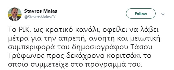 Κατόπιν, θέση πήρε για το θέμα και ο Σταύρος Μαλάς, μέσα από το twitter, ο οποίος μίλησε με πολύ καυστικό τρόπο για τον Τάσο Τρύφωνος.