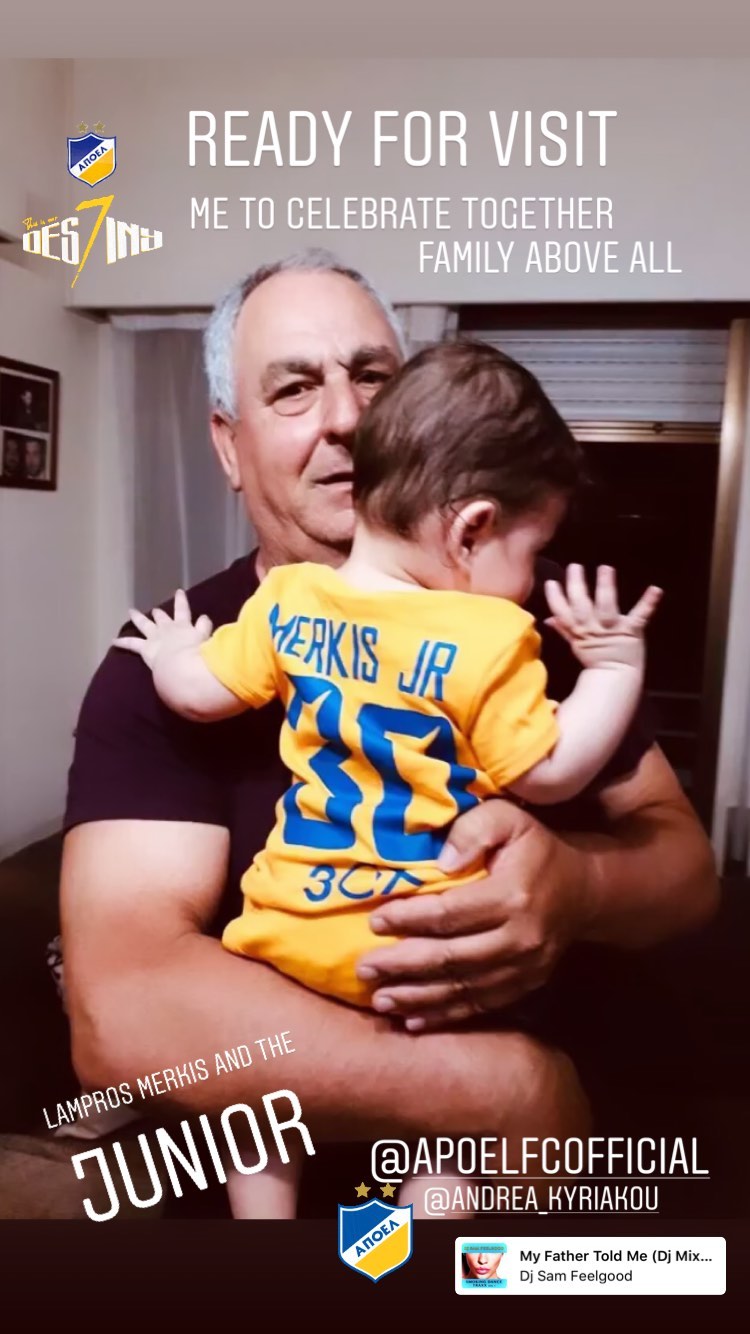 Μια πολύ όμορφη και τρυφερή στιγμή μοιράστηκε με τους διαδικτυακούς του φίλους ο Γιώργος Μερκής ο οποίος φόρεσε την φανέλα του ΑΠΟΕΛ με τον αριθμό που διαγωνίζεται και γράφοντας "Merkis Jr" στο γιο του, Λαμπρινό και τον φωτογράφησε μαζί με τον πατέρα του.
