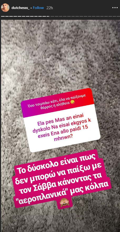 Η πανέμορφη παρουσιάστρια και μοντέλο, που διανύει τον έβδομο μήνα της εγκυμοσύνης της σε ερώτηση που δέχθηκε από follower της όσον αφορά στο αν αντιμετωπίζει κάποια δυσκολία στη δεύτερη εγκυμοσύνη της δεδομένου ότι έχει άλλο ένα παιδάκι τόσο μικρό, απάντησε λέγοντας: “Το δύσκολο είναι πως δεν μπορώ να παίξω με τον Σάββα κάνοντας τα “αεροπλανικά” μας κόλπα”. Δείτε πιο κάτω τη σχετική ανάρτηση: