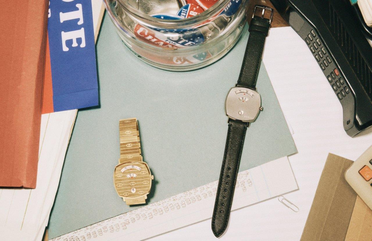 Το Grip που σχεδιάστηκε από τον Alessandro Michele δεν απευθύνεται σε ένα φύλο συγκεκριμένα, αλλά σε όλους. Το ρολόι διαθέτει κίτρινη χρυσή θήκη PVD, τρία παράθυρα που δείχνουν την ώρα, τα λεπτά και την ημερομηνία και ένα κίτρινο χρυσό PVD βραχιόλι με χαραγμένα τα αρχικά GG. Μια άλλη έκδοση του ρολογιού Grip διαθέτει θήκη από ατσάλι και πράσινο δερμάτινο λουράκι αλιγάτορα που εναλλάσεται.