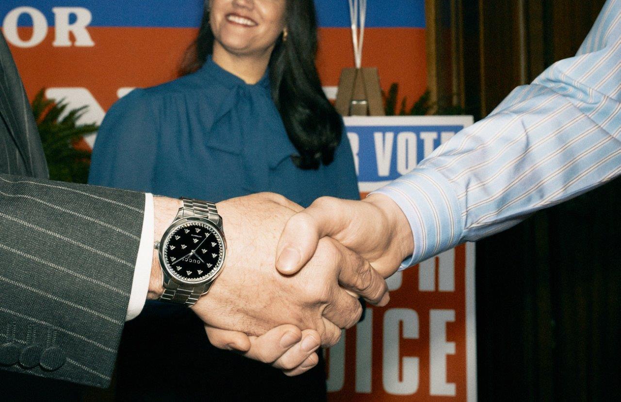 Ο Διευθυντής Δημιουργικού της Gucci, Alessandro Michele, είναι ο εμπνευστής της νέας διαφημιστικής καμπάνιας της Gucci όσον αφορά τα ρολόγια, με στοιχείο την πλέον ανθρώπινη επαφή αλληλεπίδρασης: τη χειραψία. Μια ζεστή χειρονομία, η χειραψία αποτελεί το κεντρικό θέμα της καμπάνιας.