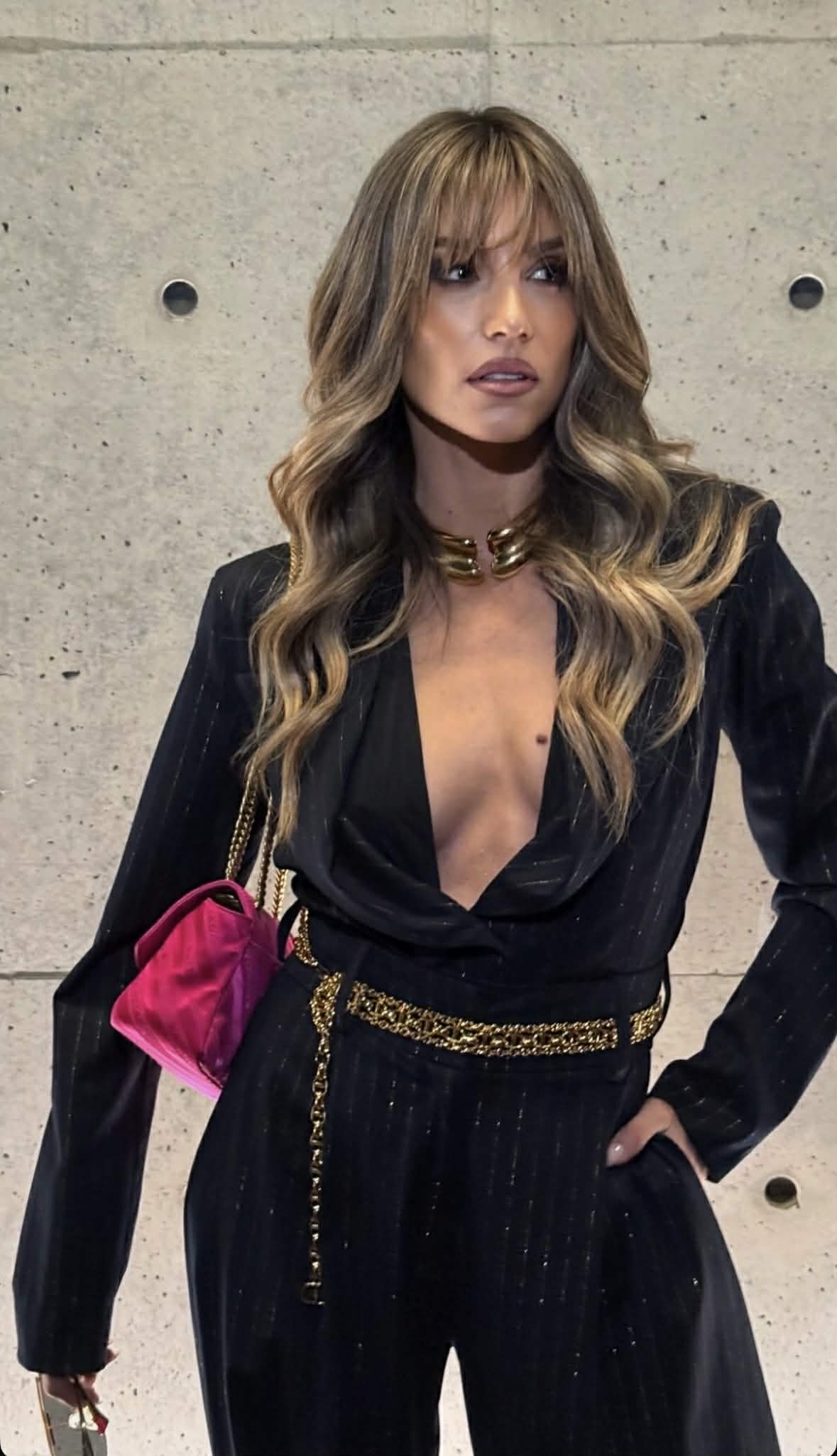 Η ηθοποιός και επιχειρηματίας επέλεξε ένα μαύρο tailored jumpsuit με διακριτικές ρίγες, ένα κομμάτι που επαναπροσδιορίζει το power dressing με σύγχρονη αισθητική. Το βαθύ ντεκολτέ και η αυστηρή γραμμή δημιουργούν μια ενδιαφέρουσα αντίθεση, αναδεικνύοντας τη σιλουέτα χωρίς υπερβολές.