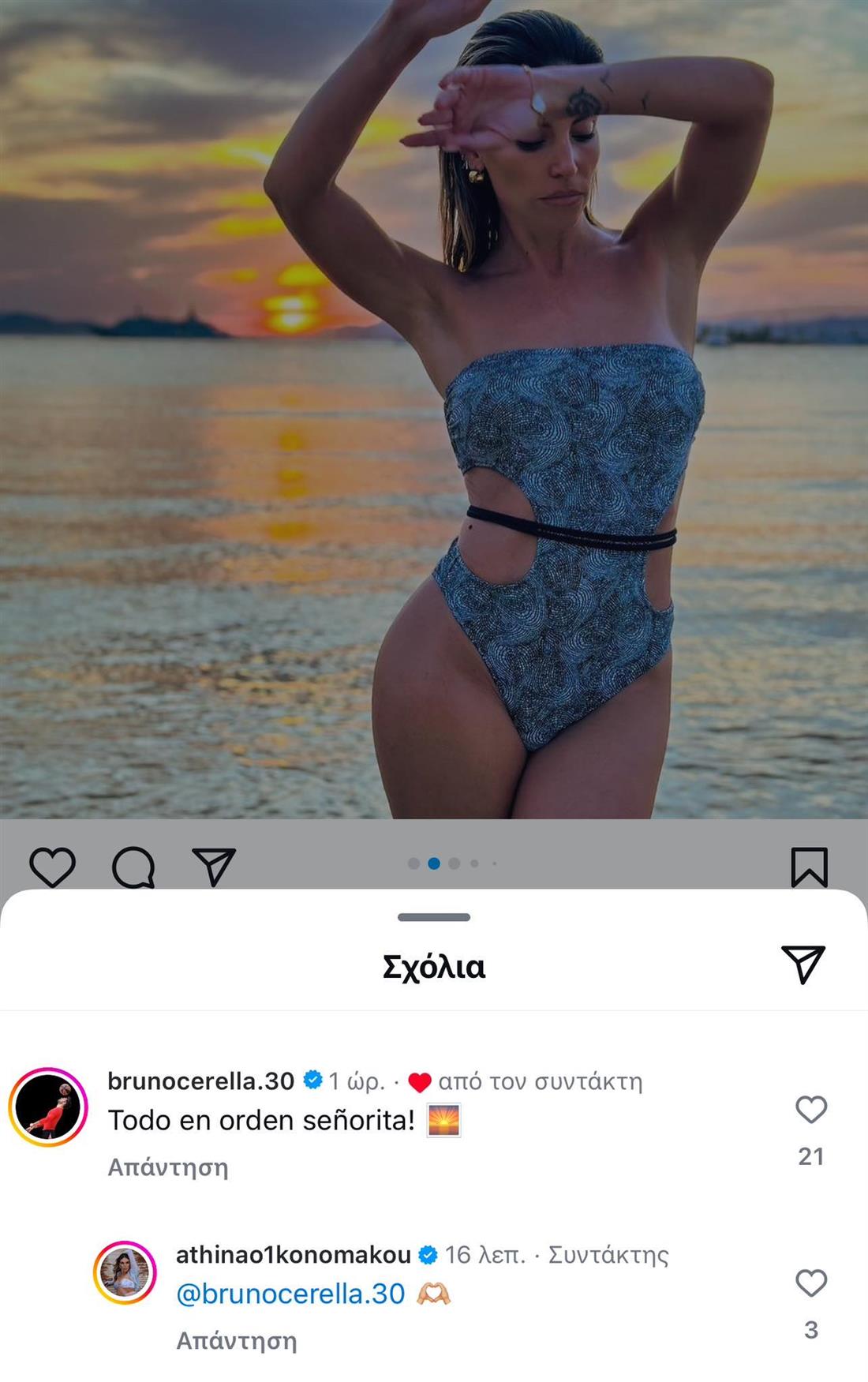 Συγκεκριμένα, το βράδυ της Δευτέρας 24 Ιουνίου, η ηθοποιός δημοσίευσε στον προσωπικό της λογαριασμό μια σειρά φωτογραφιών, στις οποίες ποζάρει με μαγιό έχοντας ως φόντο το ηλιοβασίλεμα, με τον μπασκετμπολίτσα να της σχολιάζει: «Todo en orden senorita», που σημαίνει στα ελληνικά: «Όλα με τη σειρά τους δεσποινίδα».