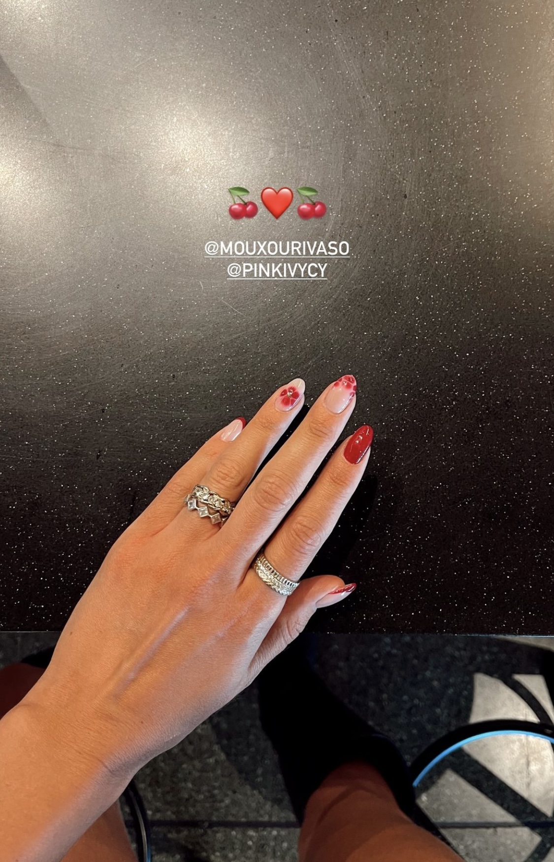 Το nail art της περιλαμβάνει ένα συνδυασμό διαφόρων τεχνικών όπως το french manicure, σχέδια νυχιών ( με λουλούδια) και το κλασικό full colour στο νύχι. Όλα αυτά γίνονται με το cherry red χρώμα που δίνει μια φρέσκια και φρουτένια νότα στα νύχια.