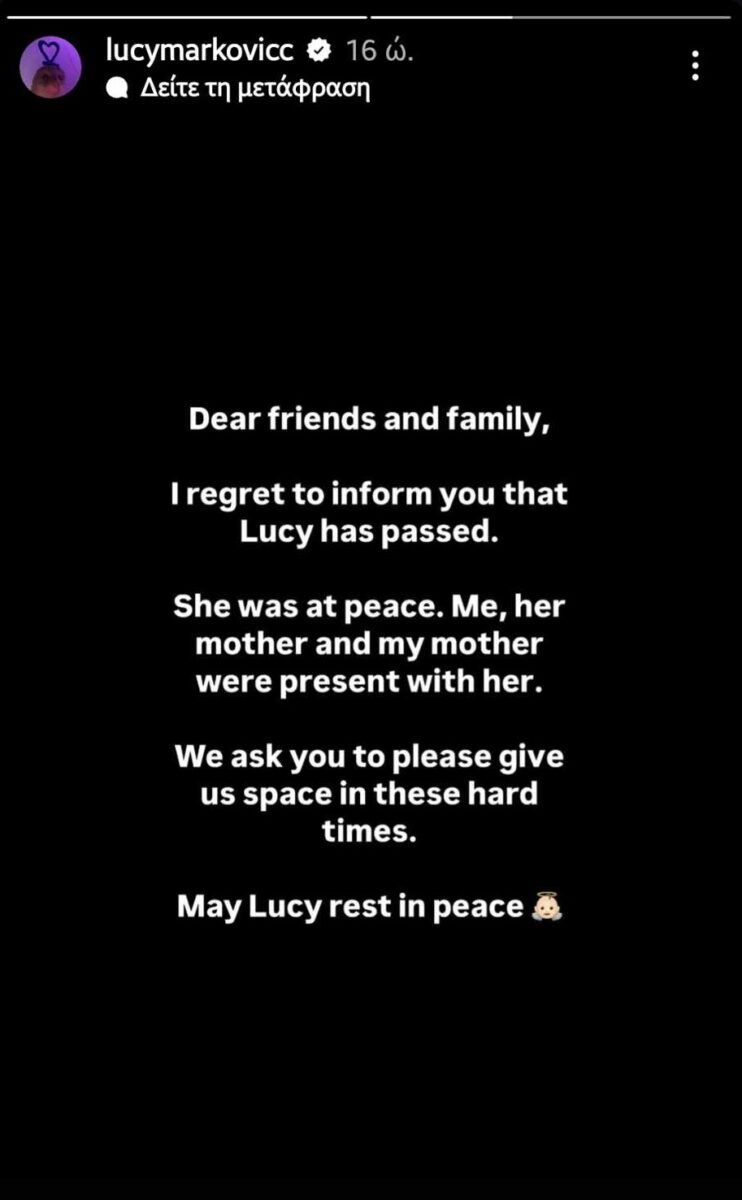 Μια θλιβερή είδηση συγκλονίζει τον χώρο της μόδας: ένα νεαρό μοντέλο με αξιόλογη διεθνή πορεία, η Lucy Markovic, έφυγε πρόωρα από τη ζωή σε ηλικία μόλις 27 ετών. Την απώλειά της έκανε γνωστή ο σύντροφός της μέσα από μια λιτή αλλά βαθιά συγκινητική ανάρτηση στο instagram Story, σκορπίζοντας θλίψη σε όσους τη γνώρισαν και την αγάπησαν.