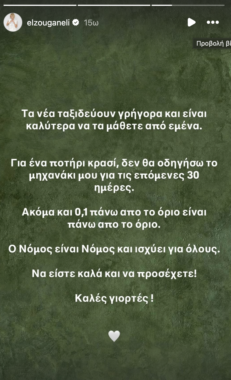 Η τραγουδίστρια, δεν θα μπορούσε να μην τοποθετηθεί για το περιστατικό που της συνέβη μέσα από τον προσωπικό της λογαριασμό στο instagram, αναφέροντας τα ακόλουθα: «Τα νέα ταξιδεύουν γρήγορα και είναι καλύτερα να τα μάθετε από εμένα. Για ένα ποτήρι κρασί, δεν θα οδηγήσω το μηχανάκι μου για τις επόμενες 30 ημέρες. Ακόμη και 0,1 πάνω από το όριο είναι πάνω από το όριο. Ο Νόμος είναι Νόμος και ισχύει για όλους. Να είστε καλά και να προσέχετε. Καλές γιορτές σε όλους». Δείτε τη σχετική ανάρτηση: