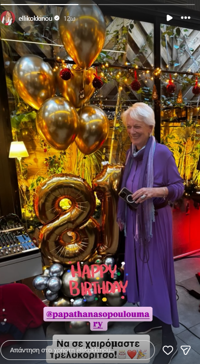 Συγκεκριμένα στο story, η κα Μαίρη Παπαθανασοπούλου, ποζάρει δίπλα στη γιορτινή διακόσμηση η οποία είχε χρυσά μπαλόνια που έφεραν τον αριθμό ηλικίας της.
