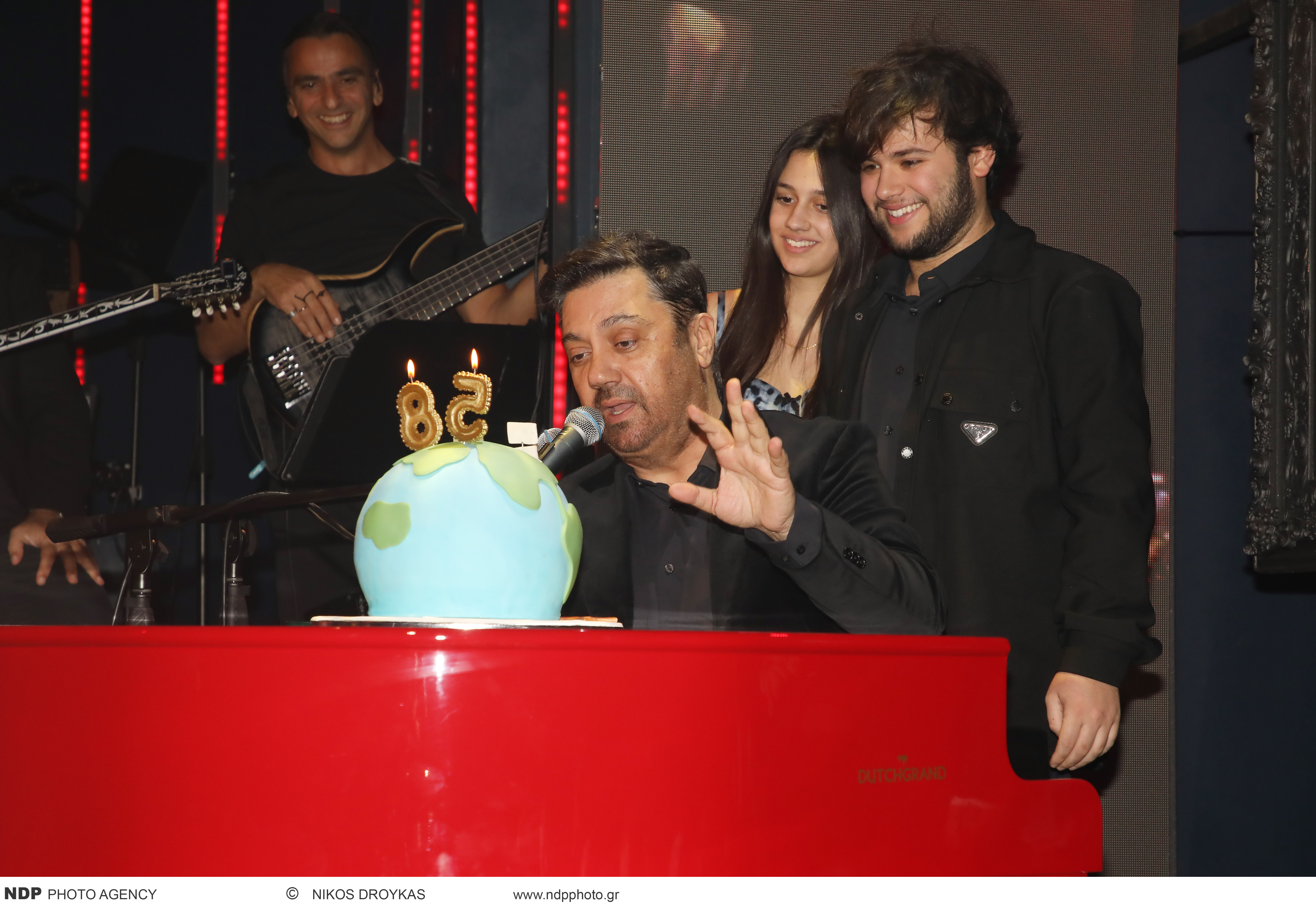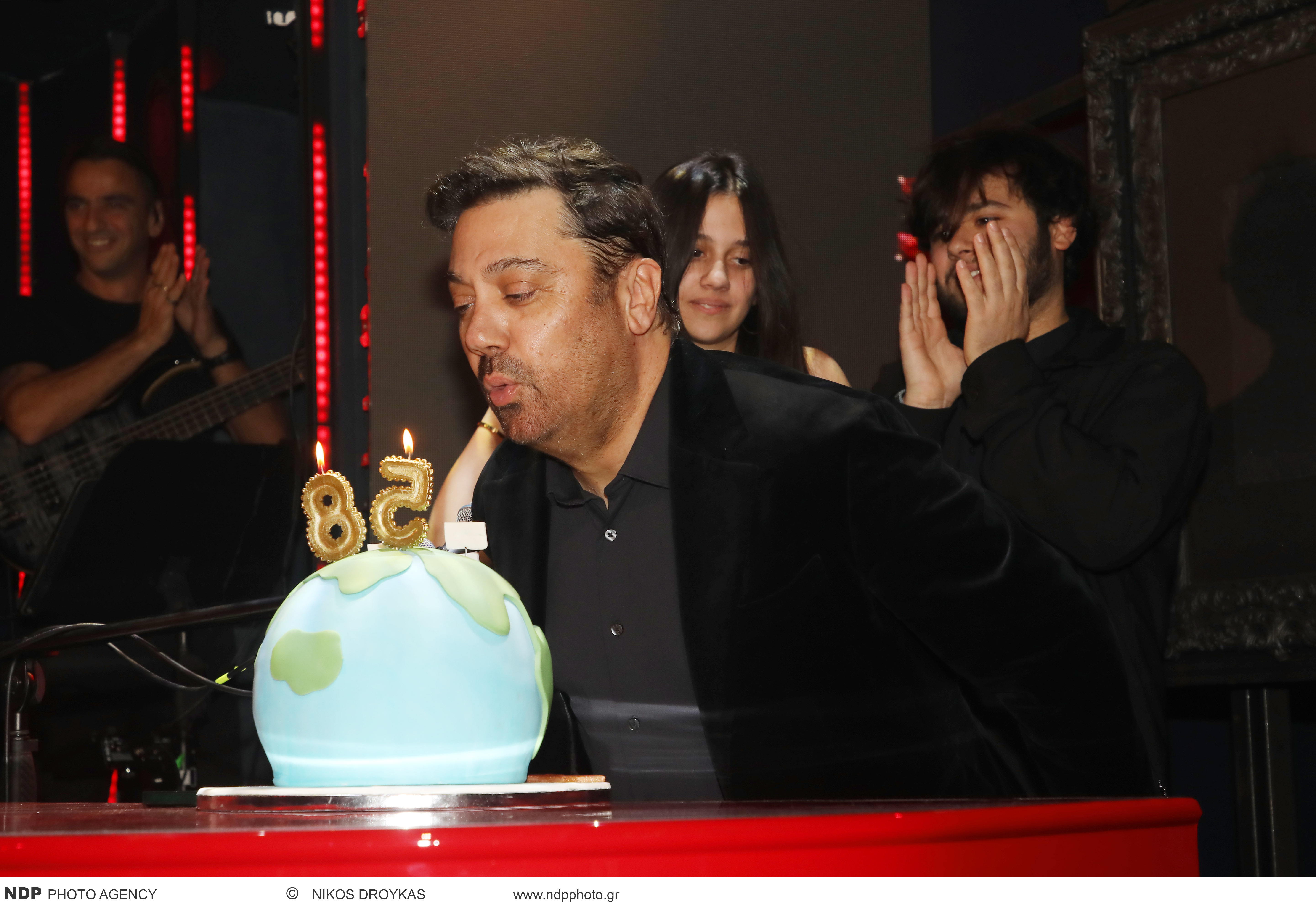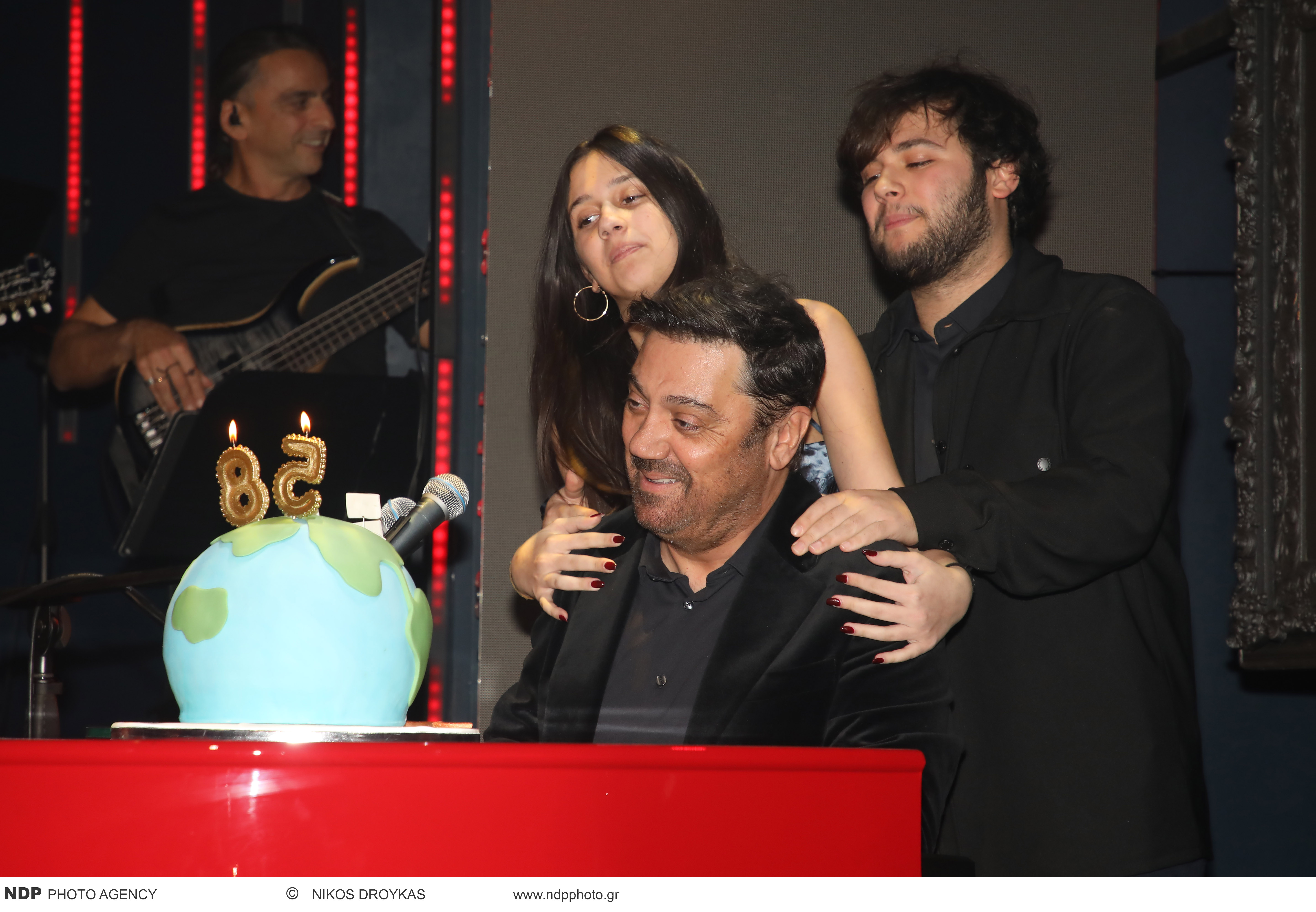 Τα παιδιά του, Μάνος και Ειρήνη, ανέβηκαν απρόσμενα στη σκηνή για να του ευχηθούν. Ο Θεοφάνους δεν έκρυψε τη συγκίνηση του καθώς έσβηνε τα 58 κεράκια της τούρτας του.