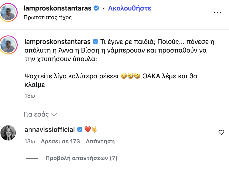 Χαρακτηριστικά στη λεζάντα του post του, έγραψε τα εξής: «Τι έγινε ρε παιδιά; Ποιους… πόνεσε η απόλυτη η Άννα η Βίσση η νάμπερουαν και προσπαθούν να την χτυπήσουν ύπουλα; Ψαχτείτε λίγο καλύτερα ρέεεει… ΟΑΚΑ λέμε και θα κλαίμε».