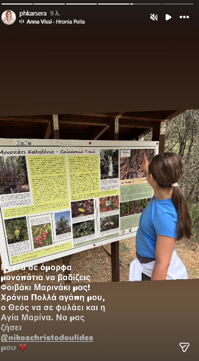 «Πάντα σε όμορφα μονοπάτια να βαδίζεις Φοιβάκι — Μαρινάκι μας. Χρόνια πολλά αγάπη μου, ο Θεός να σε φυλάει και η Αγία Μαρίνα», ενώ συνέχισε κάνοντας tag τον σύζυγό της και ΠτΔ, «Να μας ζήσει Νίκο μου».