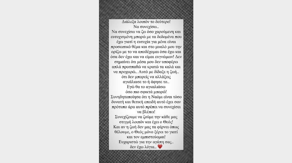 Η γνωστή planner του νησιού, μοιράστηκε στο instagram μία μακροσκελή ανάρτηση με τις σκέψεις της και ενημερώνοντάς μας για την κατάσταση της κόρη της αυτή τη στιγμή.