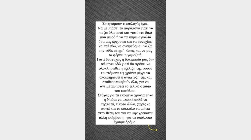 «[…] Δυστυχώς η δοκιμασία μας δεν τελειώνει εδώ γιατί θα πρέπει να ολοκληρωθεί η εξέλιξη της νόσου τα επόμενα 2-3 χρόνια μέχρι να ολοκληρωθεί η ανάπτυξή της και να σταθεροποιηθούν όλα, για να αντιμετωπιστεί το τελικό στάδιο του κοκάλου. Στόχος για τα επόμενα χρόνια είναι η Ναόμι να μπορεί απλά να περπατά, τίποτα άλλο, χωρίς να πονεί και το κόκαλο να μείνει στη θέση του για να μην χρειαστεί άλλη επέμβαση. Για τα υπόλοιπα έχουμε δρόμο […]», έγραψε. Δείτε πιο κάτω την ανάρτηση της: