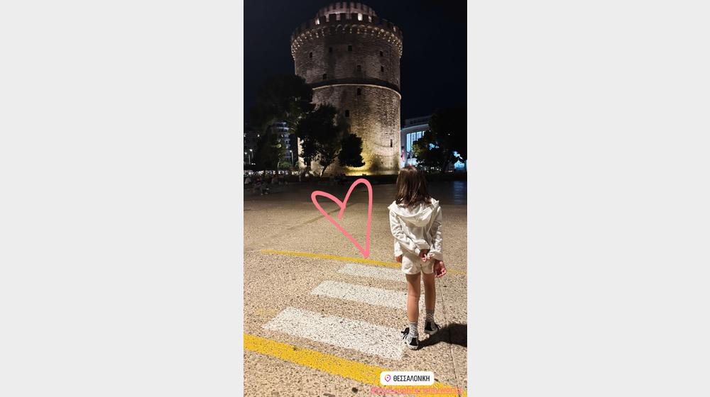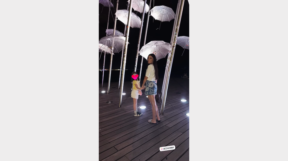 Στο πρώτο βλέπουμε την μικρή Ανατολή — Νεφέλη να φωτογραφίζεται από τη μητέρα της, μπροστά από τον Λευκό Πύργο, ενώ σε επόμενο story οι δυο τους πόζαραν χέρι- χερι, χαλαρές και με παιχνιδιάρικη διάθεση στις «Ομπρέλες» (γλυπτό Ζογγολόπουλου).