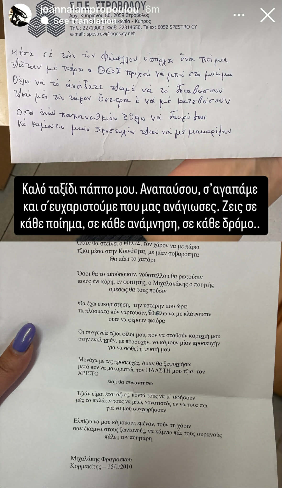 «Καλό ταξίδι πάππο μου. Αναπαύσου, σε αγαπάμε και σε ευχαριστούμε που μας ανάγιωσες. Ζεις σε κάθε ποίημα, σε κάθε ανάμνηση, σε κάθε δρόμο», έγραψε η Ιωάννα αναρτώντας το ποίημα που έγραψε ο παππούς της.