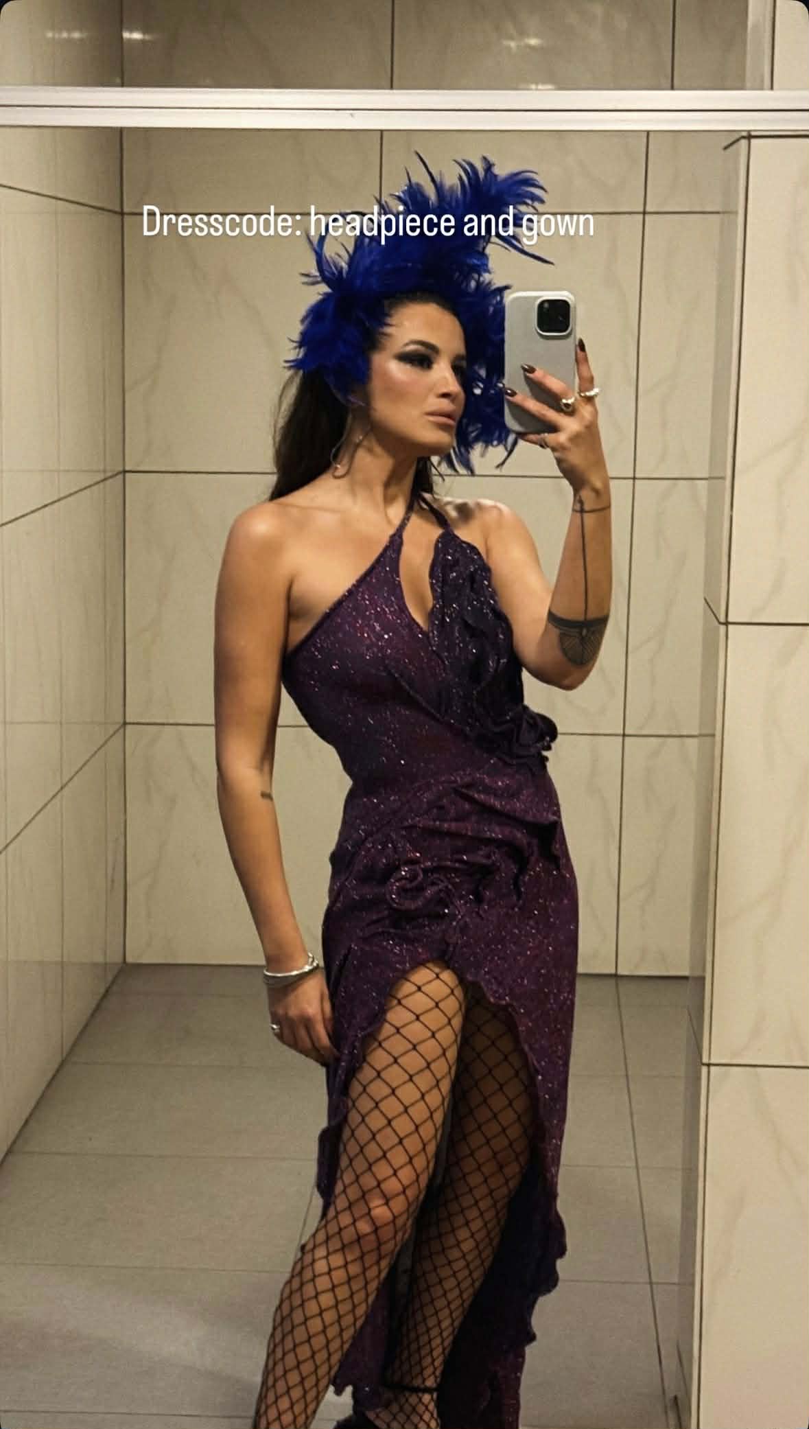 Η Κάλια ολοκλήρωσε το look με fishnet καλσόν και minimal κοσμήματα, αφήνοντας το headpiece και το φόρεμα να πρωταγωνιστήσουν.