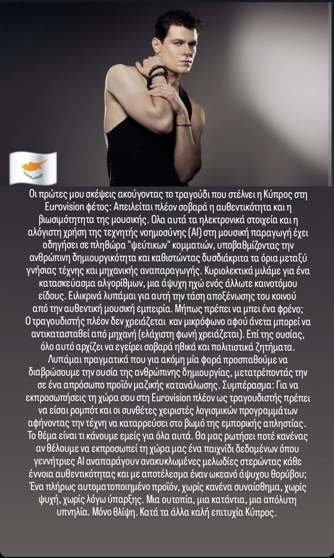 «Οι πρώτες μου σκέψεις για το τραγούδι που στέλνει η Κύπρος στη Eurovision φέτος: Απειλείται πλέον σοβαρά η αυθεντικότητα και η βιωσιμότητα της μουσικής. Όλα αυτά τα ηλεκτρονικά στοιχεία και η αλόγιστη χρήση της τεχνητής νοημοσύνης στη μουσική παραγωγή έχει οδηγήσει σε πληθώρα ‘ψεύτικων’ κομματιών, υποβαθμίζοντας την ανθρώπινη δημιουργικότητα […] Λυπάμαι πραγματικά που για ακόμα μία φορά προσπαθούμε να διαβρώσουμε την ουσία της ανθρώπινης δημιουργίας, μετατρέποντάς την σε ένα απρόσωπο προϊόν μαζικής κατανάλωσης […] Μία ουτοπία, μία κατάντια, μία απόλυτη υπνηλία. Μόνο θλίψη. Κατά τα άλλα, καλή επιτυχία Κύπρος», έγραψε. Δείτε πιο κάτω ολόκληρη την ανάρτηση: