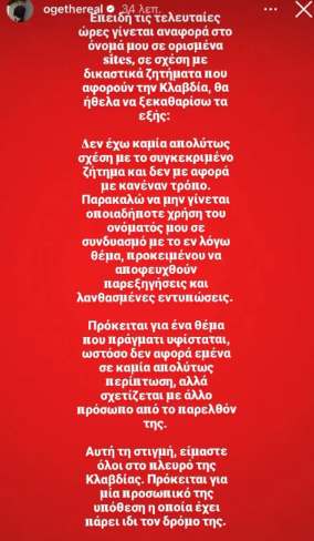 Με ανάρτησή του στο instagram το μεσημέρι της Μεγάλης Δευτέρας, ο OGE τόνισε ότι δεν έχει καμία σχέση με τη δικαστική υπόθεση της πρώην συντρόφου του και παρακάλεσε να μη συσχετίζεται το όνομά του με τα συγκεκριμένα δημοσιεύματα.
