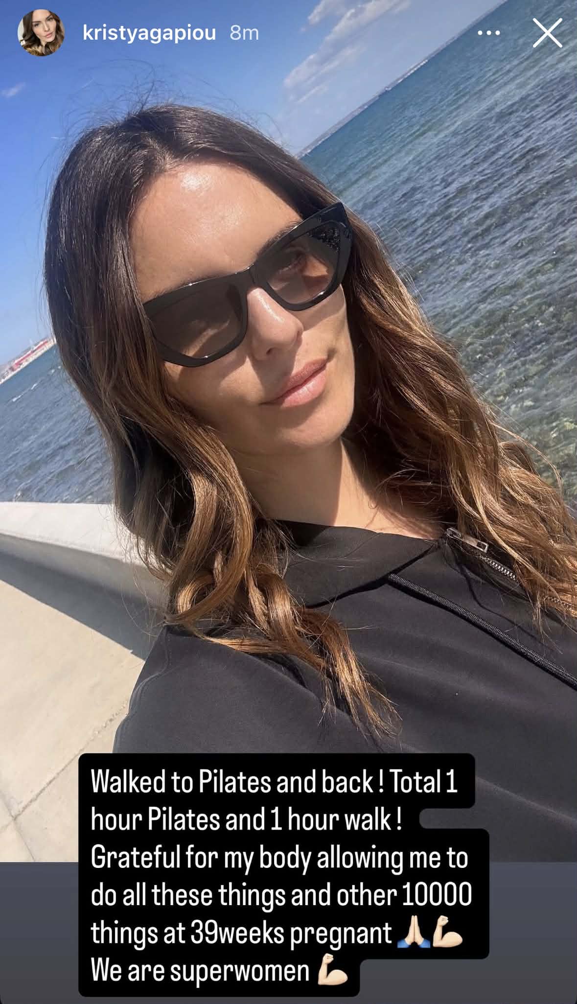 «Περπάτημα στις pilates και πίσω. Συνολικά μία ώρα pilates και μία ώρα περπάτημα. Ευγνώμων που το σώμα μου, μου επιτρέπει να κάνω όλα αυτά τα πράγματα κι άλλα 10.000 πράγματα στην 39η εβδομάδα κύησης. Είμαστε super γυναίκες», έγραψε.