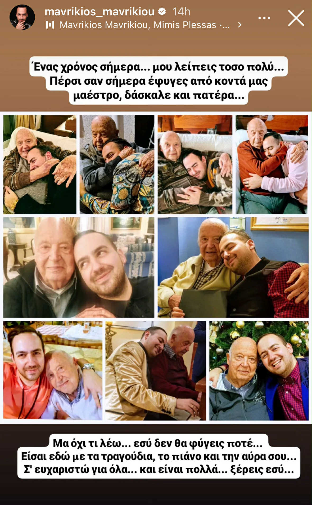 Σαν σήμερα πριν από έναν χρόνο «έφυγε» από τη ζωή ο σπουδαίος Μίμης Πλέσσας. Ο Μαυρίκιος Μαυρικίου, ο οποίος είχε συνεργαστεί πολύ στενά με τον σπουδαίο μουσικοσυνθέτη, έκανε μία πολύ συγκινητική ανάρτηση σε story στον προσωπικό του λογαριασμό στο instagram.