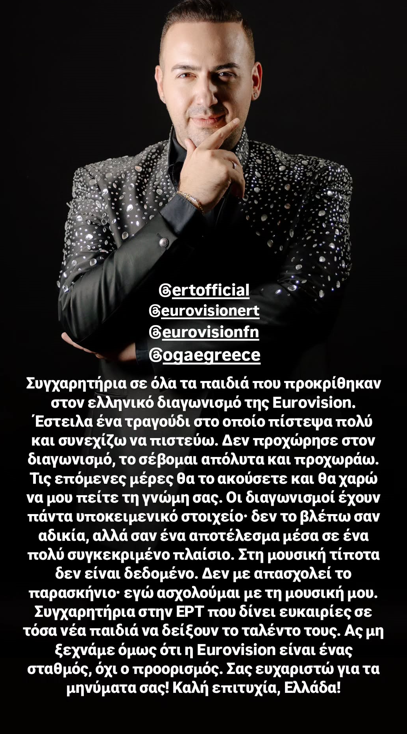 πολύ συγκεκριμένο πλαίσιο. Στη μουσική τίποτα δεν είναι δεδομένο. Δεν με απασχολεί το παρασκήνιο, εγώ ασχολούμαι με τη μουσική μου. Συγχαρητήρια στην ΕΡΤ που δίνει ευκαιρίες σε τόσα νέα παιδιά να δείξουν το ταλέντο τους. Ας μη ξεχνάμε όμως ότι η Eurovision είναι ένας σταθμός, όχι ο προορισμός. Σας ευχαριστώ για τα μηνύματά σας! Καλή επιτυχία, Ελλάδα».