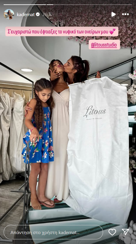 Το μεσημέρι της Τρίτης, 26 Αυγούστου, η Νάταλι Κάτερ μέσα από story που ανήρτησε στον λογαριασμό της στο instagram, μας έδειξε τη στιγμή που παραλαμβάνει το νυφικό των ονείρων της, όπως η ίδια σχολιάζει.