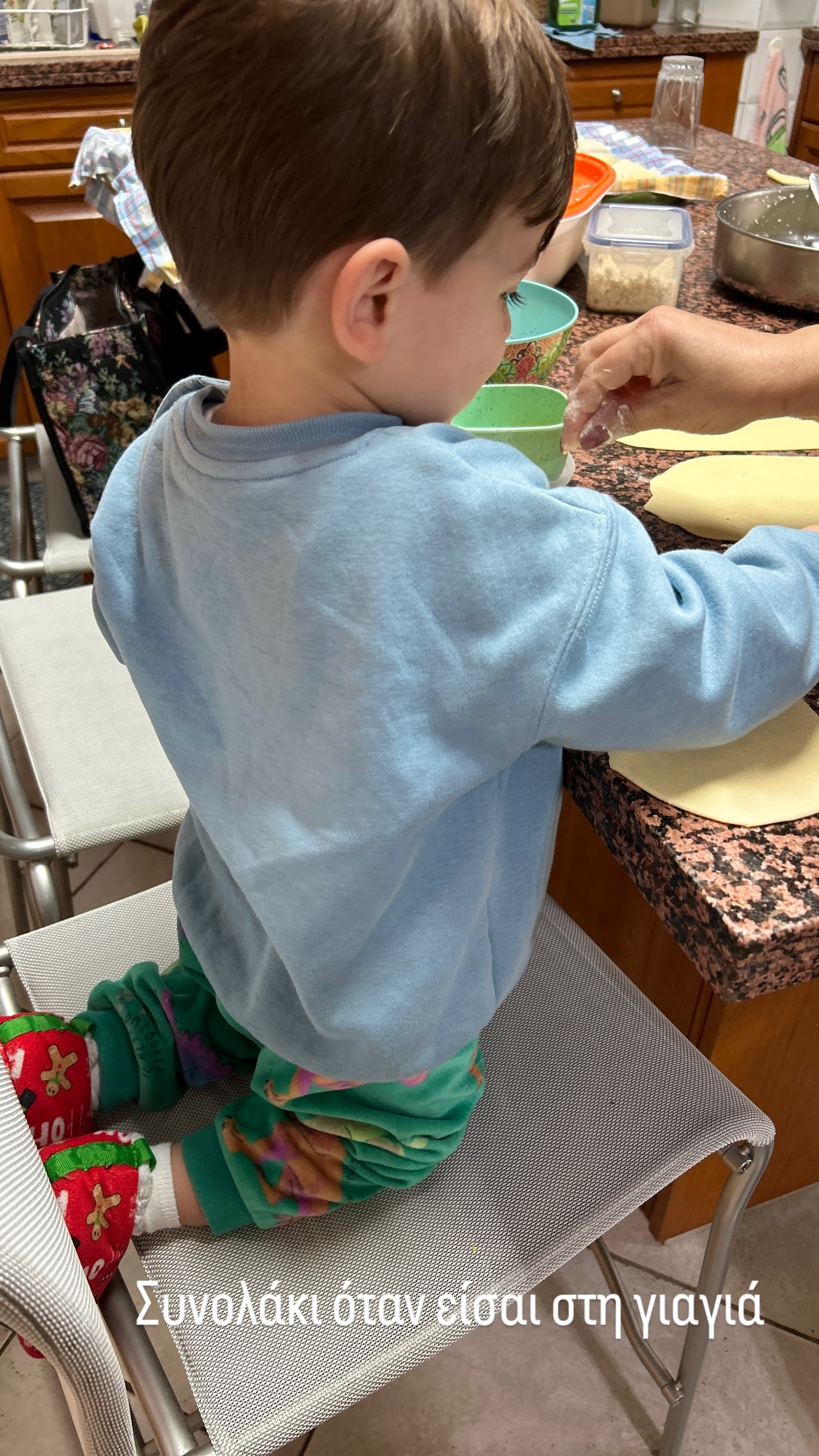 Η αγαπημένη ηθοποιός απαθανάτισε τον 2χρονο γιο της, Άρη, σε μια γλυκιά στιγμή στο σπίτι της γιαγιάς του, καθώς οι δυο τους ζύμωναν μαζί στην κουζίνα. Στο στιγμιότυπο, ο μικρός φαίνεται να συμμετέχει με ενθουσιασμό στη διαδικασία.