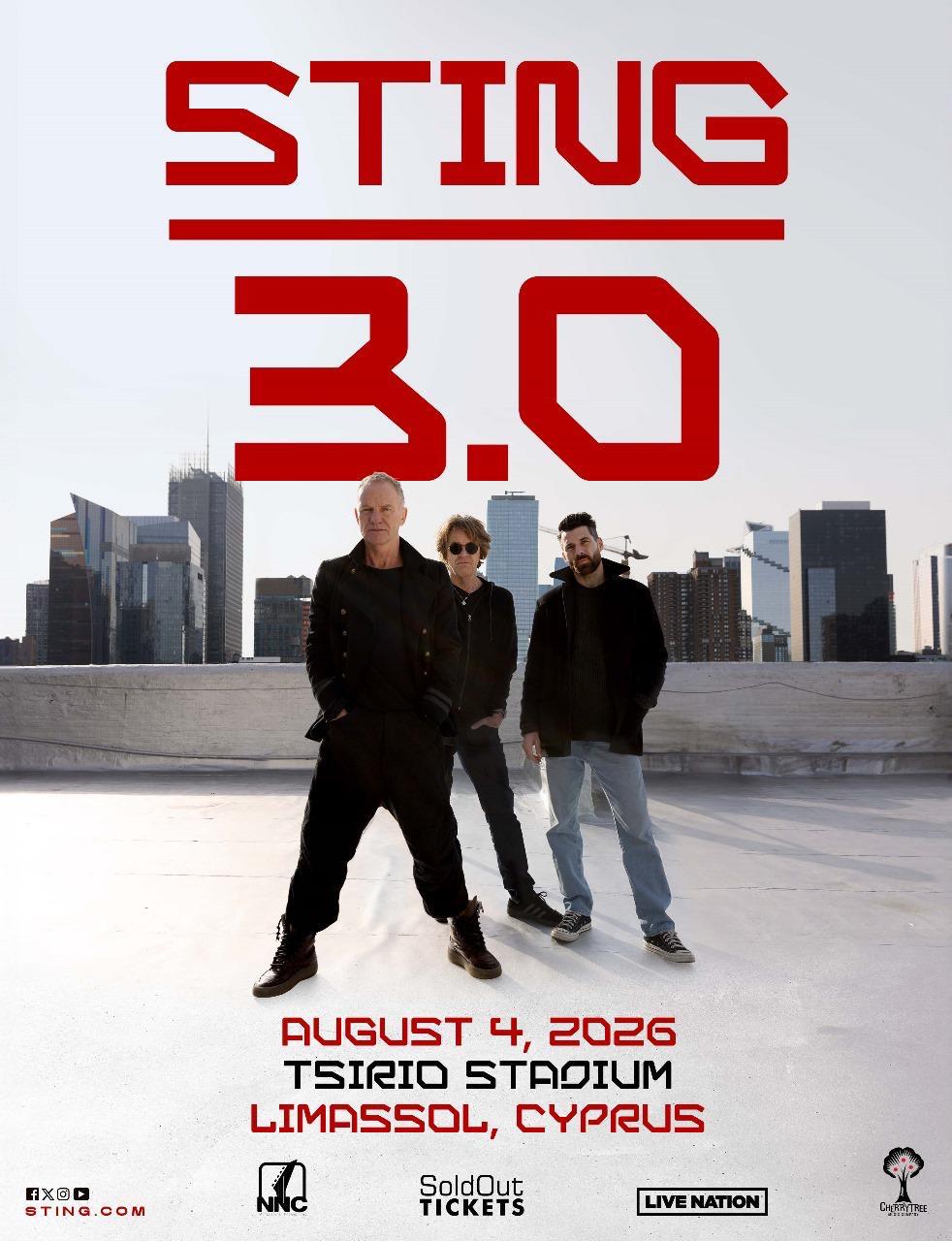 Η γενική πώληση θα ξεκινήσει την Τρίτη, 11 Νοεμβρίου, στις 12:00. Σήμερα, ο καλλιτέχνης STING, νικητής 17 Grammy Awards, πρόσθεσε μια νέα συναυλία στο ιδιαίτερα αναγνωρισμένο “STING 3.0” World Tour, που παρουσιάζεται από τις Cherrytree Music Company και Live Nation, στην Κύπρο, στις 4 Αυγούστου 2026, στο Tsirio Stadium, Λεμεσός, που προωθείται από την NNC Megaevents Productions, Cyprus.