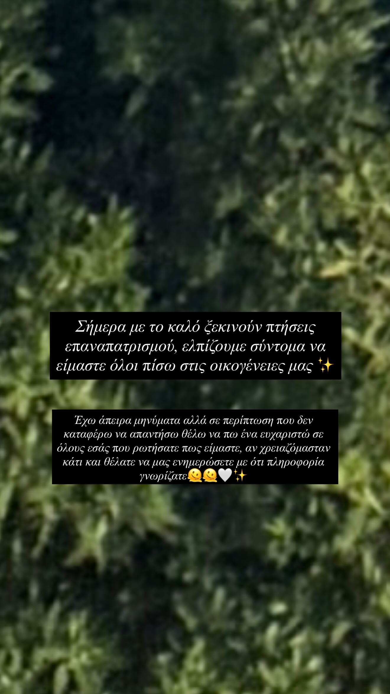 Νωρίτερα σήμερα το πρωί, η Στυλιάνα, σε νέα της ανάρτηση σε story στο instagram, ενημέρωσε το διαδικτυακό της κοινό, ότι σήμερα ξεκινούν οι πτήσεις επαναπατρισμού και εύχεται σύντομα να είναι όλοι ασφαλείς στις οικογένειές τους. Κατόπιν, δεν παρέλειψε να ευχαριστήσει όλους όσοι της έστειλαν μηνύματα για παροχή βοήθειας και πληροφοριών.