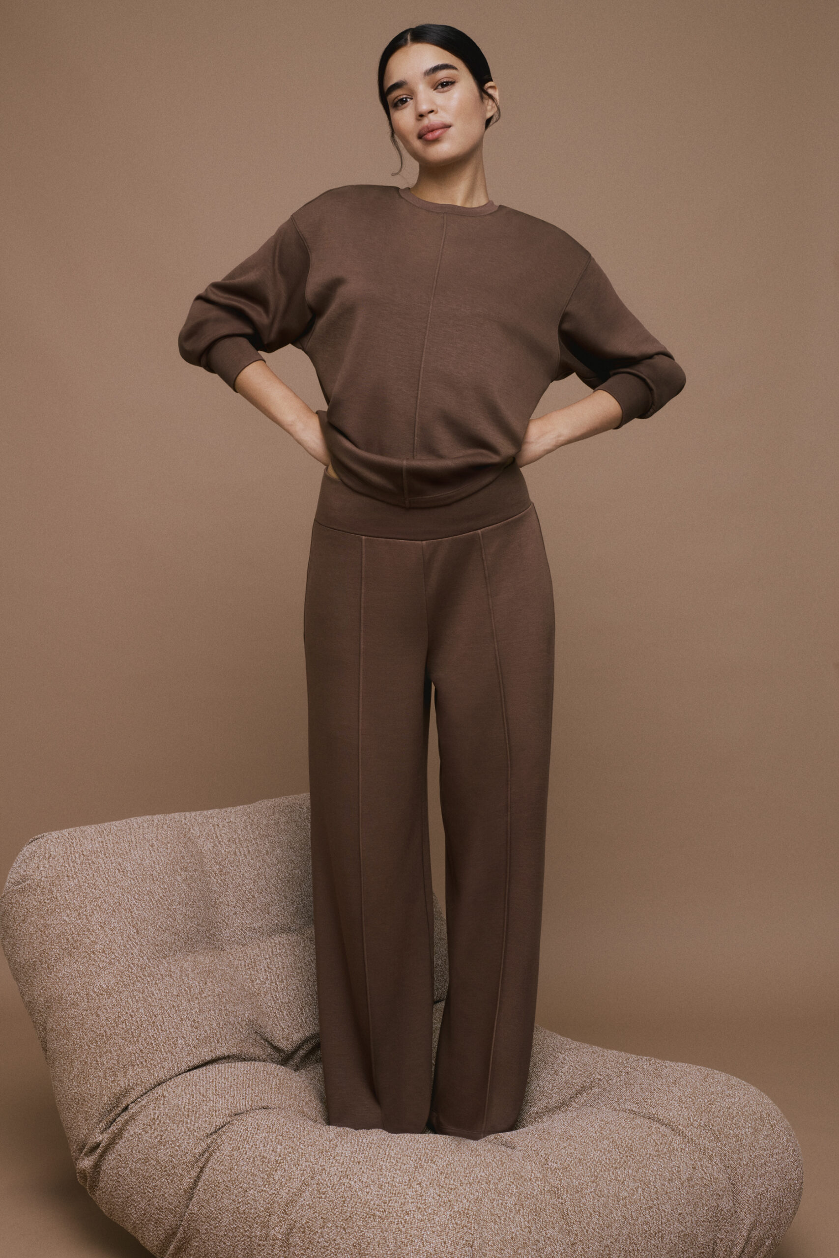 Ανάμεσα στα κομμάτια-κλειδιά της συλλογής ξεχωρίζουν: Το hoodie με φερμουάρ και κορδόνια, ένα απόλυτο καθημερινό must-have που ενώνει τη λειτουργικότητα με το casual cool στοιχείο. Το crew-neck sweatshirt με ριμπ λεπτομέρεια στο κέντρο, που φέρνει μια διακριτική δόση μοντέρνας κομψότητας στο χαλαρό everyday look. Το παντελόνι palazzo με πιέτες στο μπροστινό μέρος, που επιμηκύνει τη σιλουέτα και αναδεικνύει τη θηλυκότητα μέσα από μια αέρινη, ραφιναρισμένη γραμμή. Και τέλος, η straight-leg εκδοχή, ιδανική για όσους προτιμούν τη διαχρονική, καθαρή αισθητική που συνδυάζει απλότητα και δυναμισμό.