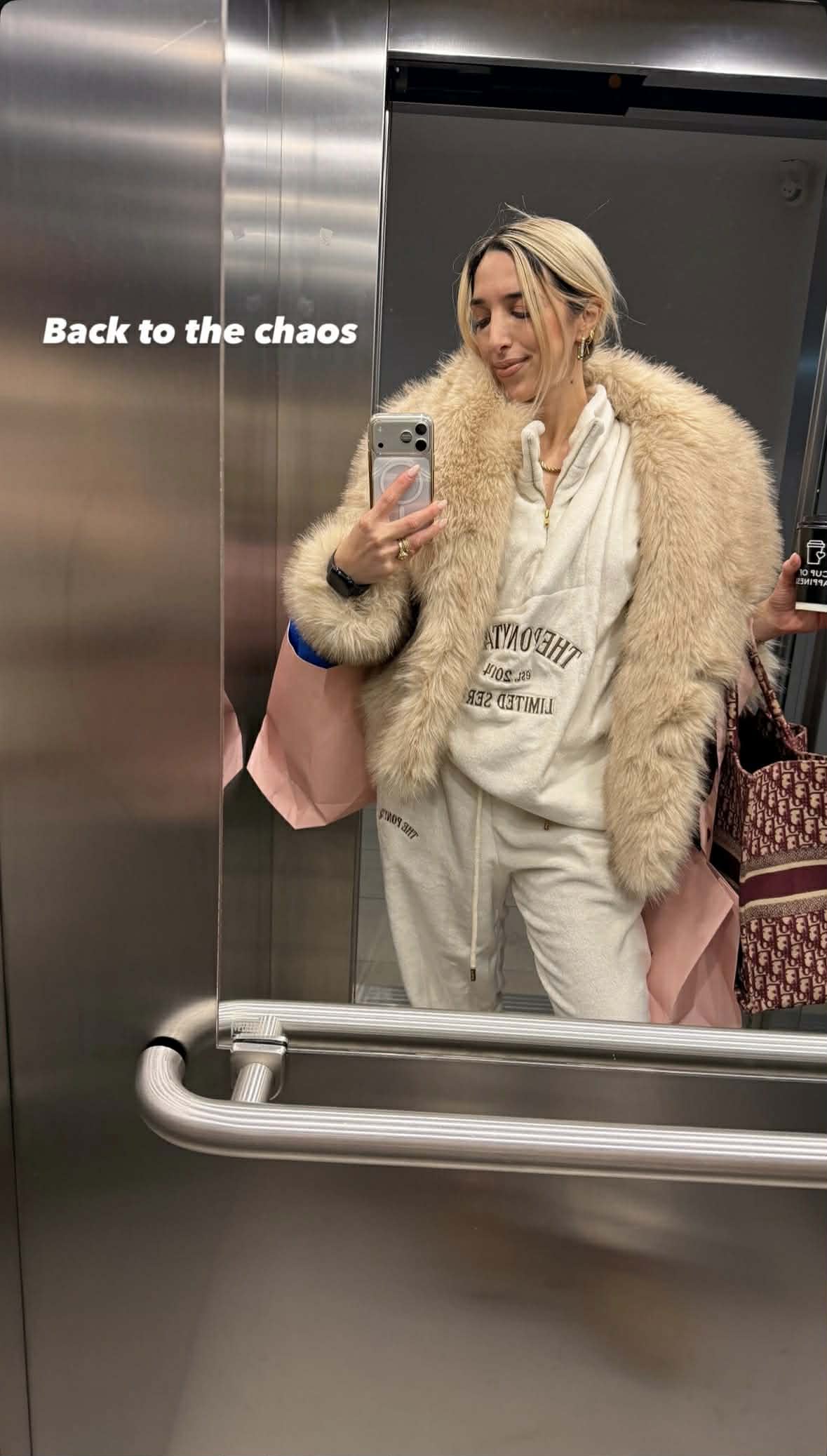 Η λευκή faux γούνα έρχεται να ανατρέψει τους κανόνες του casual, προσθέτοντας πολυτέλεια και fashion attitude. Είναι το κομμάτι που «ντύνει» τη φόρμα και τη μετατρέπει από καθημερινή επιλογή σε statement εμφάνιση πόλης. Το styling ολοκληρώνεται με τη designer τσάντα Dior, που λειτουργεί ως το απόλυτο luxury contrast και δίνει στο σύνολο στιλιστική αξιοπιστία.