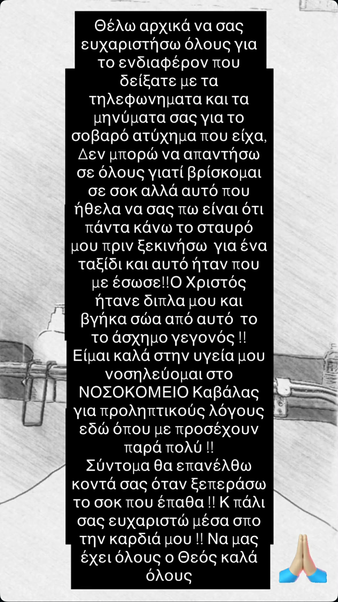 «Θέλω αρχικά να σας ευχαριστήσω όλους για το ενδιαφέρον που δείξατε με τα τηλεφωνήματα και τα μηνύματά σας για το σοβαρό ατύχημα που είχα. Δεν μπορώ να απαντήσω σε όλους γιατί βρίσκομαι σε σοκ αλλά αυτό που ήθελα να σας πω είναι ότι πάντα κάνω το σταυρό μου πριν ξεκινήσω για ένα ταξίδι και αυτό ήταν που με έσωσε! Ο Χριστός ήταν δίπλα μου και βγήκα σώα από αυτό το άσχημο γεγονός! Είμαι καλά στην υγεία μου, νοσηλεύομαι στο Νοσοκομείο Καβάλας για προληπτικούς λόγους εδώ όπου με προσέχουν παρά πολύ! Σύντομα θα επανέλθω κοντά σας όταν ξεπεράσω το σοκ που έπαθα! Και πάλι σας ευχαριστώ μέσα από την καρδιά μου!! Να μας έχει όλους ο Θεός καλά» έγραψε η Πηγή Δεβετζή.