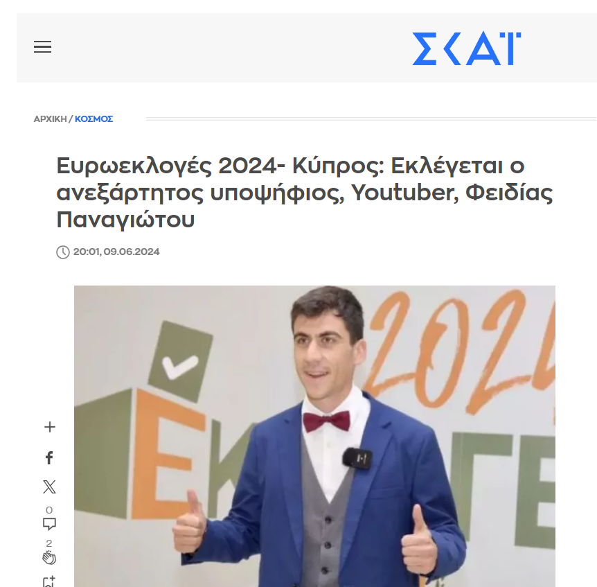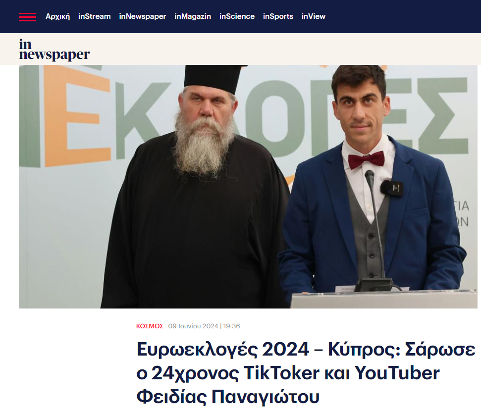 «Στην Κύπρο καταγράφεται η μεγάλη έκπληξη των ευρωεκλογών, καθώς μετά την παρουσίαση του exit poll για τις εκλογές της Τοπικής Αυτοδιοίκησης και για τις ευρωεκλογές 2024 αναδείχθηκε ένας υποψήφιος εκτός της πολιτικής σκηνής. Πρόκειται για τον γνωστό tiktoker με το όνομα «Fidias» ο οποίος κατεβαίνει στις ευρωεκλογές ως ανεξάρτητος», αναφέρει το Έθνος.