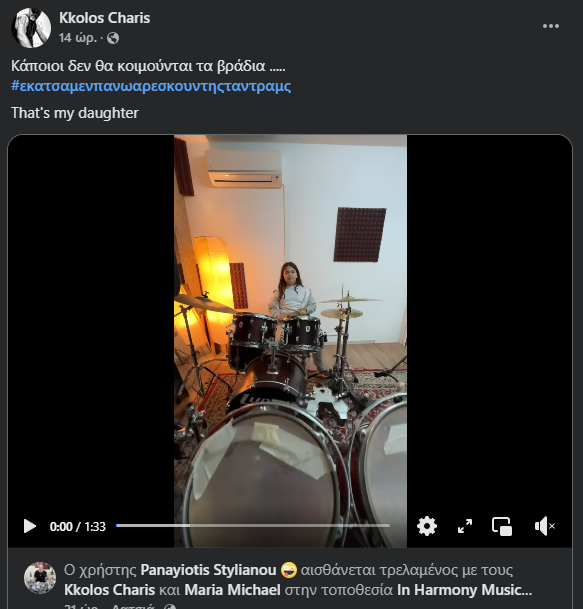 Συγκεκριμένα, η 8χρονη Γιασεμίνα, που έχει αποκτήσει ο ηθοποιός με την επίσης γνωστή ηθοποιό του νησιού μας, Μαρία Μιχαήλ, παίζει drums, και ο ίδιος δεν μπορεί να μην τρολάρει την όλη κατάσταση, βλέποντας το εν λόγο βίντεο.