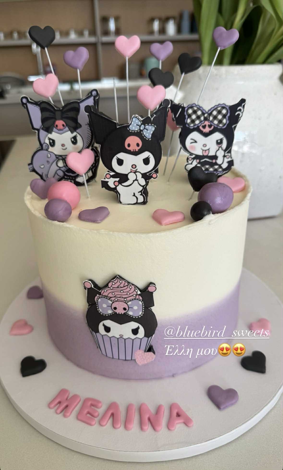 Η τούρτα είναι δίχρωμη, με αποχρώσεις του λευκού και του λιλά, και διακοσμημένη με καρδιές σε χρώματα ροζ, μαύρο και μοβ. Πάνω της υπάρχουν διάφορες φιγούρες της Kuromi σε διαφορετικές στάσεις και εκφράσεις, καθώς και μικρές μπάλες και καρδιές. Δείτε τη σχετική εικόνα που εντοπίσαμε στα social media: