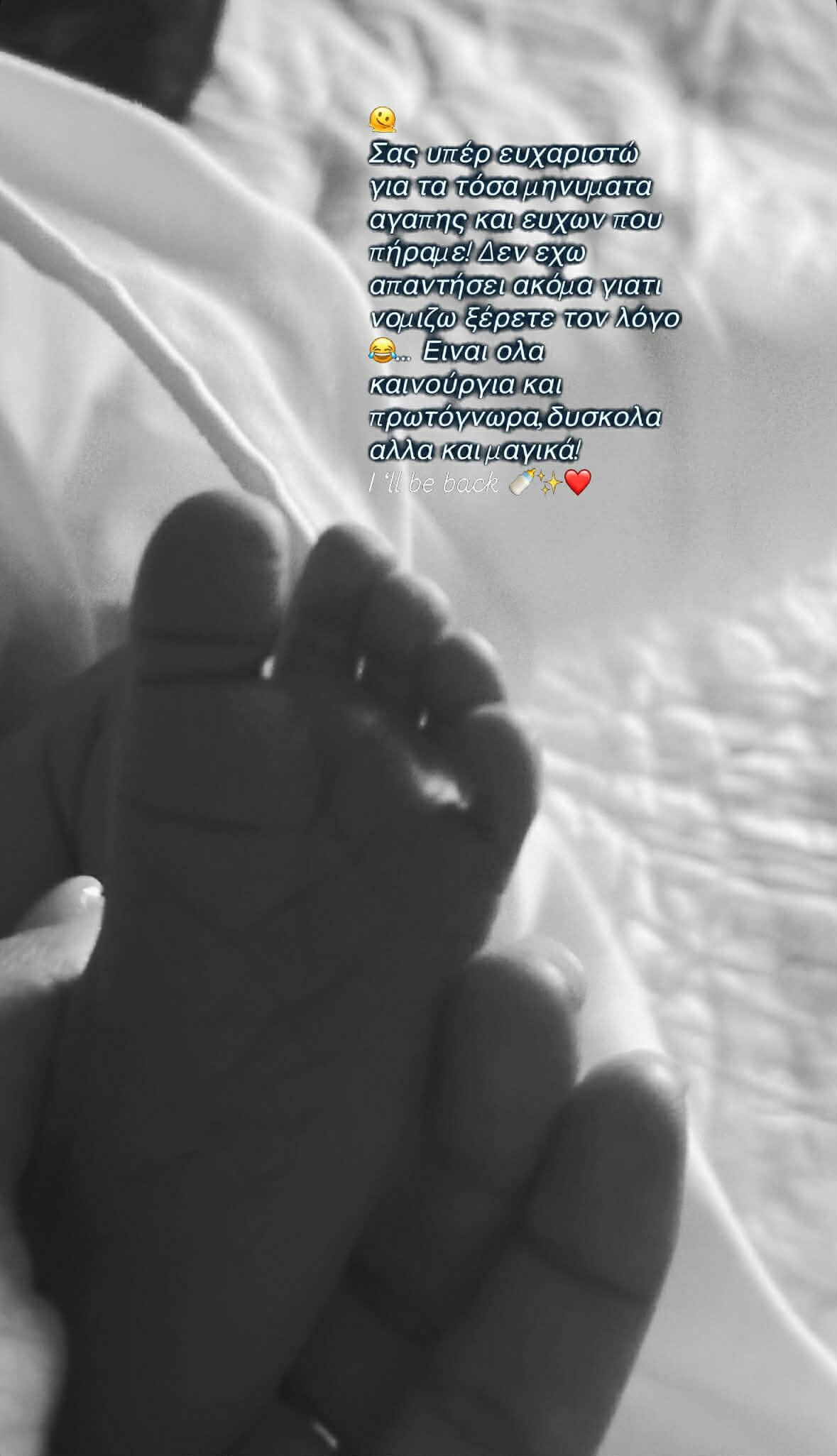 Η Κύπρια ηθοποιός, δημοσίευσε τα πατουσάκια του μικρού Ντάνιελ, γράφοντας τα εξής όμορφα λόγια στο story της: «Σας υπερευχαριστώ για τα τόσα μηνύματα αγάπης και ευχών που πήραμε! Δεν έχω απαντήσει γιατί νομίζω ξέρετε τον λόγο. Είναι όλα καινούργια και πρωτόγνωρα, δύσκολα αλλά και μαγικά».