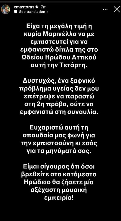 «Είχα τη μεγάλη τιμή, η κυρία Μαρινέλλα να με εμπιστευτεί να εμφανιστώ δίπλα της στο Ωδείο Ηρώδου Αττικού αυτή την Τετάρτη. Δυστυχώς, ένα ξαφνικό πρόβλημα υγείας δεν μου επέτρεψε να παραστώ στην δεύτερη πρόβα, ούτε να εμφανιστώ στη συναυλία. Ευχαριστώ αυτή τη σπουδαία μας φωνή για την εμπιστοσύνη κι εσάς για τα μηνύματά σας. Είμαι σίγουρος πως όσοι βρεθείτε στο κατάμεστο Ηρώδειο θα ζήσετε μια αξέχαστη μουσική εμπειρία» έγραψε ο καλλιτέχνης αγνοώντας τα δημοσιεύματα.