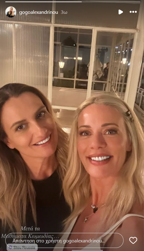 Χαρακτηριστικά, η Γωγώ Αλεξανδρινού σε story της στο instagram, ανήρτησε τη φωτογραφία που έβγαλε με τη Ζέτα Μακρυπούλια, από βραδινή τους έξοδο για φαγητό.