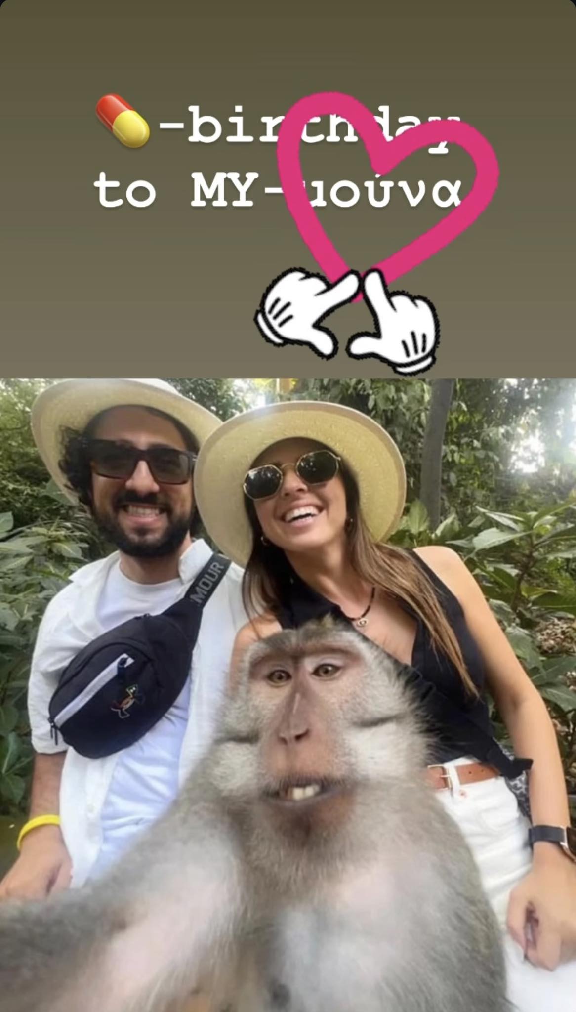 Συγκεκριμένα, βλέπουμε το ζευγάρι να ποζάρει με μία μαϊμού και ο Αυγουστή έγραψε στην εικόνα χαριτολογώντας και χρησιμοποιώντας λογοπαίγνιο: «Χρόνια πολλά στη δική μου μαϊμούνα». Δείτε τη σχετική εικόνα πιο κάτω: