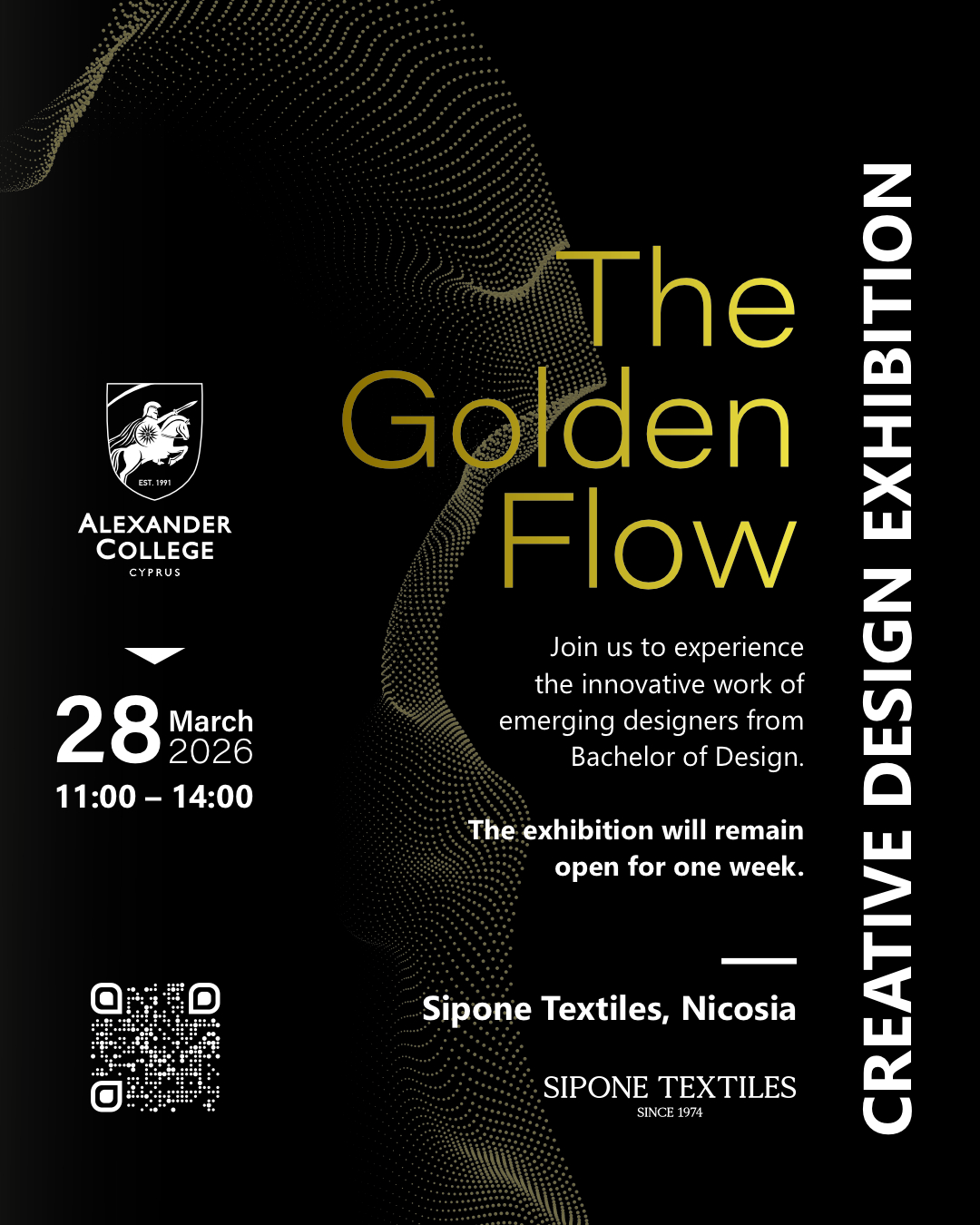 Το Alexander College παρουσιάζει τα εγκαίνια της ξεχωριστής δημιουργικής έκθεσης “The Golden Flow” το Σάββατο 28 Μαρτίου, από τις 11:00 έως τις 14:00, στον χώρο του Sipone Textiles στη Λευκωσία. Οι φοιτητές των τμημάτων Fashion, Interior και Graphic Design παρουσιάζουν το πρώτο μέρος μιας σειράς events με θεματικό άξονα το χρυσό στοιχείο, που θα κορυφωθεί στο μεγάλο Final Show.