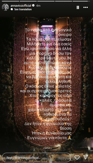 Σε story που δημοσίευσε, δείχνοντάς μας, το κατάμεστο Καλλιμάρμαρο από ψηλά, γράφει τα εξής: «Ξύπνησα από ένα μαγικό όνειρο. Τα λόγια μου τελείωσαν. Μιλήσατε για όλα εσείς. Εγώ προσπάθησα για άλλη μια φορά να δώσω τον καλύτερο εαυτό μου σε αυτό που αγαπώ να κάνω. Κι εσείς με δικαιώσατε. Εύχομαι όλοι στις ζωές μας να βρίσκουμε αγάπη και αληθινή φιλία. Ο κόσμος έγινε χαλεπός και οι σχέσεις δυσεύρετες. Χτες και προχτές είδα αγκαλιές, πρόσωπα όμορφα και χαμογελαστά στόματα παθιασμένα να τραγουδούν! Δεν ήταν η συναυλία της Βίσση.Ήταν η Συναυλία μας. Ευγνώμων για πάντα».