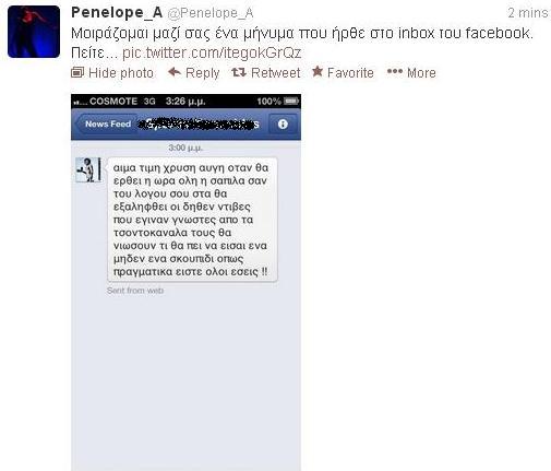 «Μοιράζομαι μαζί σας ένα μήνυμα που ήρθε στο inbox του Facebook. Πείτε…».
