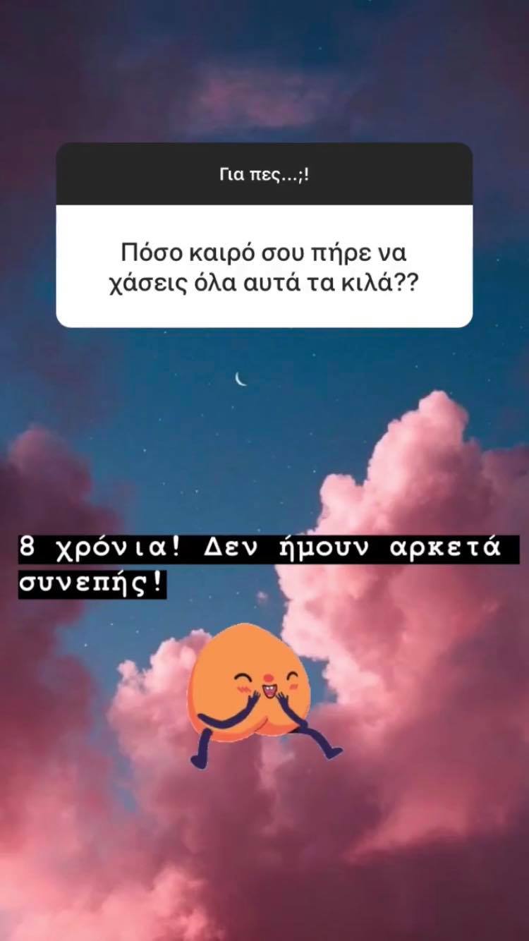 Αρκετοί ήταν οι διαδικτυακοί της φίλοι που επεσήμαναν αυτή της την αλλαγή και η ίδια χωρίς να αποκαλύψει πόσα κιλά έχει χάσει ή ζυγίζει σήμερα, μας έδειξε τους κοιλιακούς της που άρχισαν να σχηματίζονται και η χαρά της είναι μεγάλη. Αξίζει αν σημειωθεί, πως είπε πως της πήρε οκτώ χρόνια να αποκτήσει την εμφάνιση που ήθελε καθώς δεν ήταν αρκετά συνεπής.