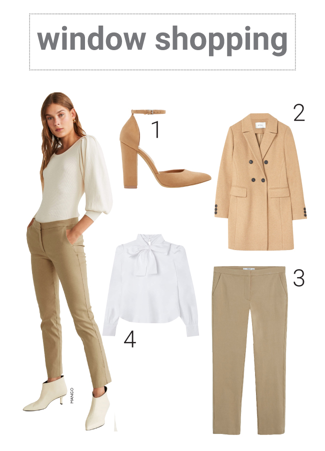 Τα αντικείμενα στην πιο πάνω εικόνα είναι: 1. Γόβα, Aldo / 2. Παλτό, Stradivarius / 3. Παντελόνι, Mango / 4. Βow neck μπλούζα, Stradivarius.