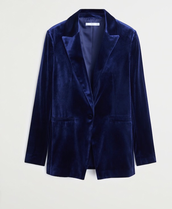 Πρόκειται για ένα blazer βελούδινο σακάκι σε σκούρο μπλε χρώμα από τα καταστήματα Mango το οποίο κοστίζει 69.99 ευρώ. Το βελούδο είναι ένα ύφασμα που ενδείκνυται για τα γιορτινά outfits αφού μπορεί να δώσει ένα luxury twist στο σύνολο σου.