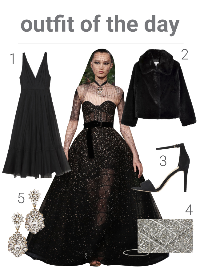 Η εντυπωσιακή τούλινη τουαλέτα σε μαύρο χρώμα είναι ιδανική επιλογή για τη βραδιά του ρεβεγιόν, συνδύασε την με οικολογική γούνα και κλασικό πέδιλο στο ίδιο χρώμα. Επέλεξε σκουλαρίκια σε vintage σχέδιο τονίζοντας έτσι τη ρομαντική διάθεση του συνόλου.