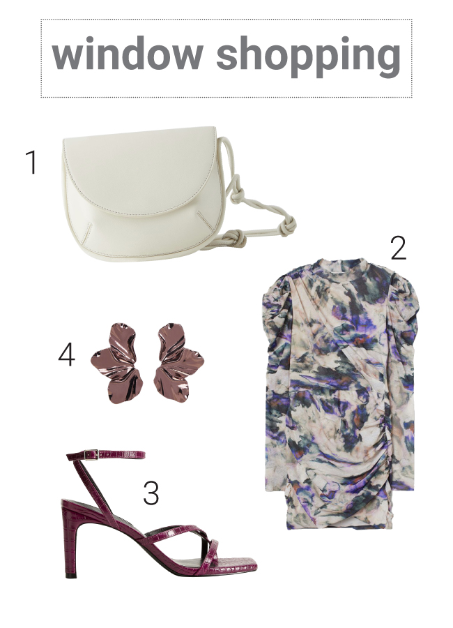 Τα αντικείμενα στην πιο πάνω εικόνα είναι: 1. Τσάντα, Zara / 2. Φόρεμα, Η&Μ / 3. Πέδιλο, Mango / 4. Σκουλαρίκια, Parfois.