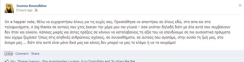 Ευχαριστώντας για τις ευχές, τους πάμπολλους φίλους της στο μέσο κοινωνικής δικτύωσης -η Joanna Κασουλίδου είχε χθες τα γενέθλιά της- έγραψε σήμερα μεταξύ άλλων: "Κάποιες μικρές και άπλες πράξεις σε κάνουν να καταλαβαίνεις την αξία του να επενδύουμε σε πιο ουσιαστικά πράγματα που είχαμε ξεχάσει! Όπως στις αληθινές ανθρώπινες σχέσεις, σε συναισθήματα, σε αυτούς που αγαπάμε, στην ουσία τη ζωή μας, στα όνειρά μας… διότι όλα αυτά είναι μόνο δικά μας και κάνεις δεν μπορεί να μας τα κλέψει ή να τα κουρέψει!". Διαβάστε ολόκληρο το μήνυμά της εδώ!